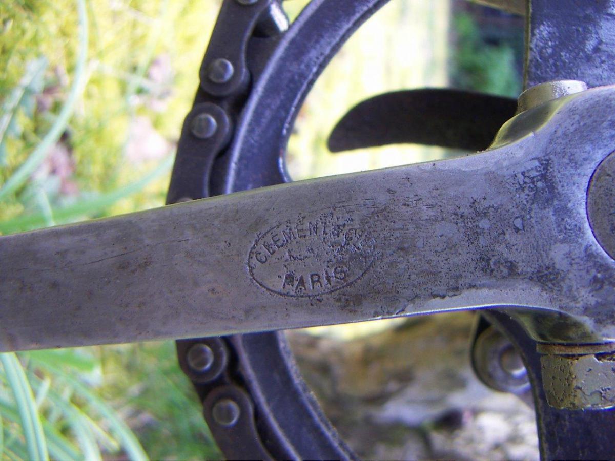 It is one of the earliest models of the Clement cross frame, with a different system of bracket adjustment fixation than the later models I have seen. Also look at the front hub and compare it to Clement no. 20814. On this older bicycle the middle part is iron, the later model has a completely brass hub.